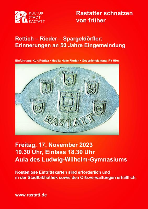 Die städtische Gesprächsreihe „Rastatter schnatzen von früher“ geht weiter: Am Freitag, 17. November 2023, lädt der Kundenbereich Kultur- und Sportförderung um 20 Uhr in die Aula des Ludwig-Wilhelm-Gymnasiums ein. Thema des Gesprächsabends: „Rettich, Rieder, Spargeldörfler – 50 Jahre Eingemeindungen“. Nach einer Einführung von Kurt Pottiez "schnatzt" Moderator Pit Hirn an diesem Abend mit seinen Gästen über die vielen Facetten der Rastatter Ortsteile Plittersdorf, Wintersdorf, Ottersdorf, Rauental und Niederbühl/Förch. Er gibt spannende Einblicke in das Leben der Ortsteile und die Zeit nach der Eingliederung der Gemeinden zu Beginn der 70er-Jahren. Für beste musikalische Unterhaltung am Veranstaltungsabend sorgt in bewährter Weise Hans Florian.